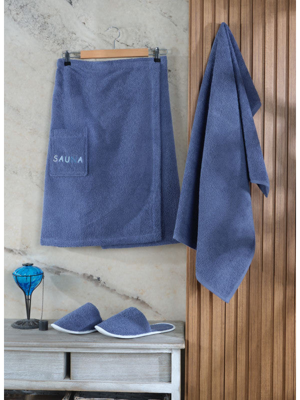 Комплект для сауни включає: спідницю для сауни, капці, махровий рушник для волосся 50x90 см. Доступні різні кольори комплектів для сауни, будь ласка, уточнюйте по телефону або електронною поштою.